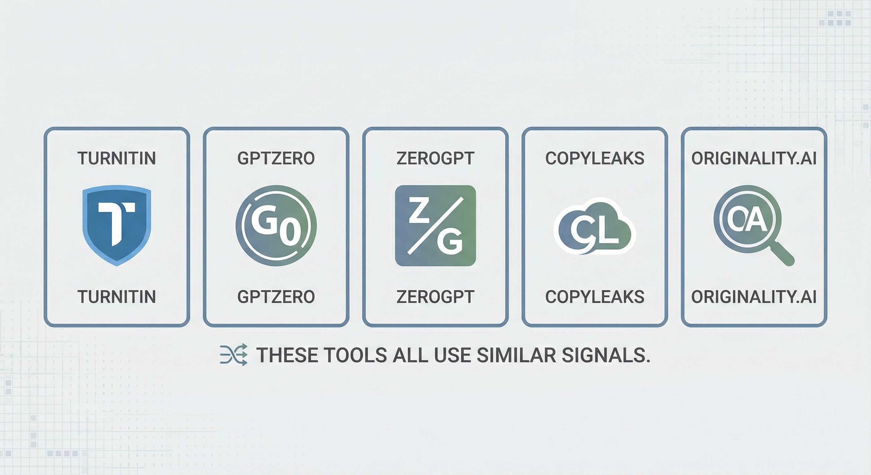 Turnitin AI detector is one of the most common in academia. Schools also use GPTZero, ZeroGPT, Copyleaks, and Originality.ai. Each is trained slightly differently, but they all rely on similar signals: perplexity, burstiness, and phrasing. A turnitin checker (or turnitin checker for students) is usually the same as Turnitin's plagiarism + AI report your instructor sees.