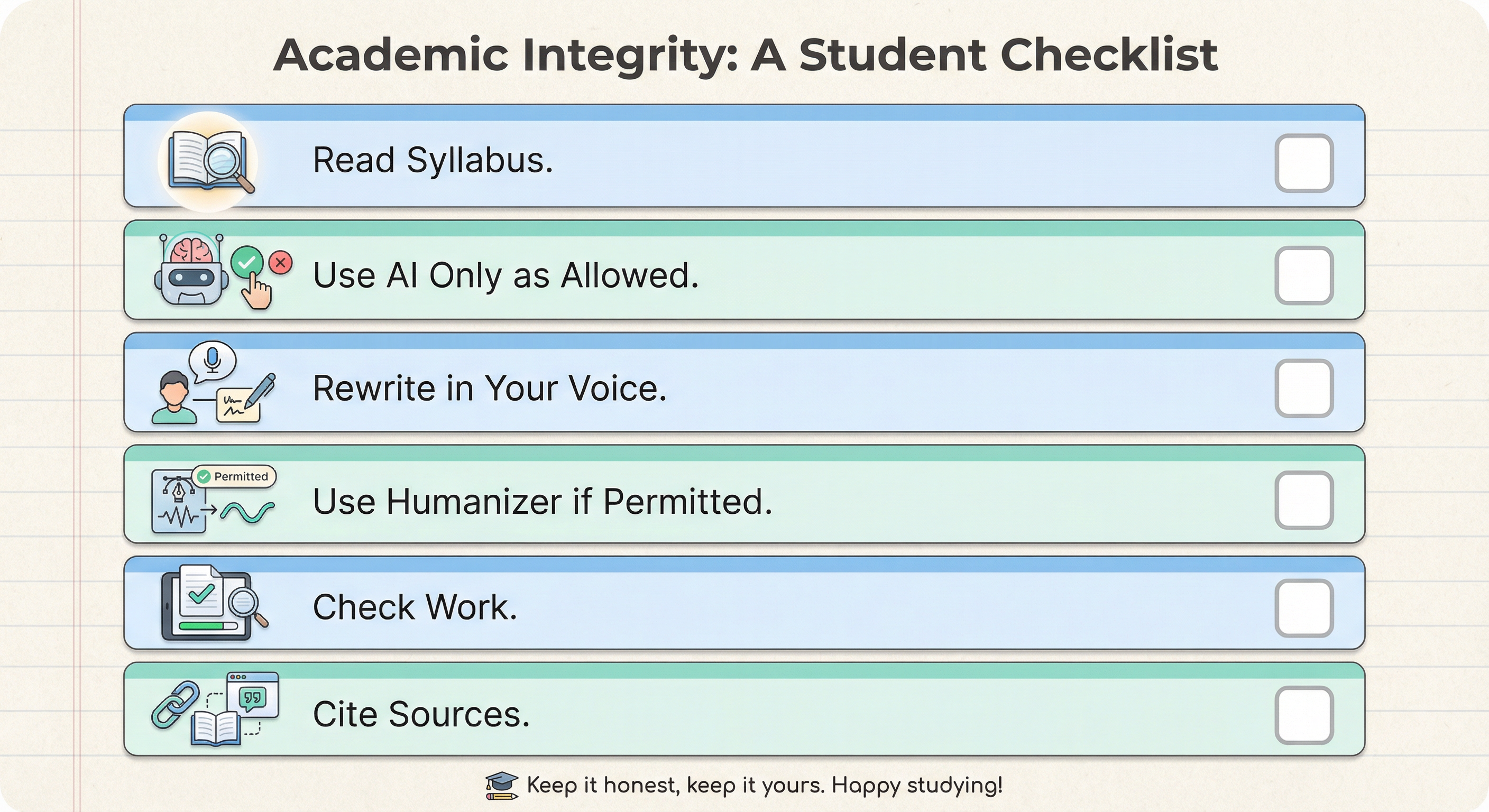 - Read your syllabus and academic integrity policy — What does your school say about AI and tools?