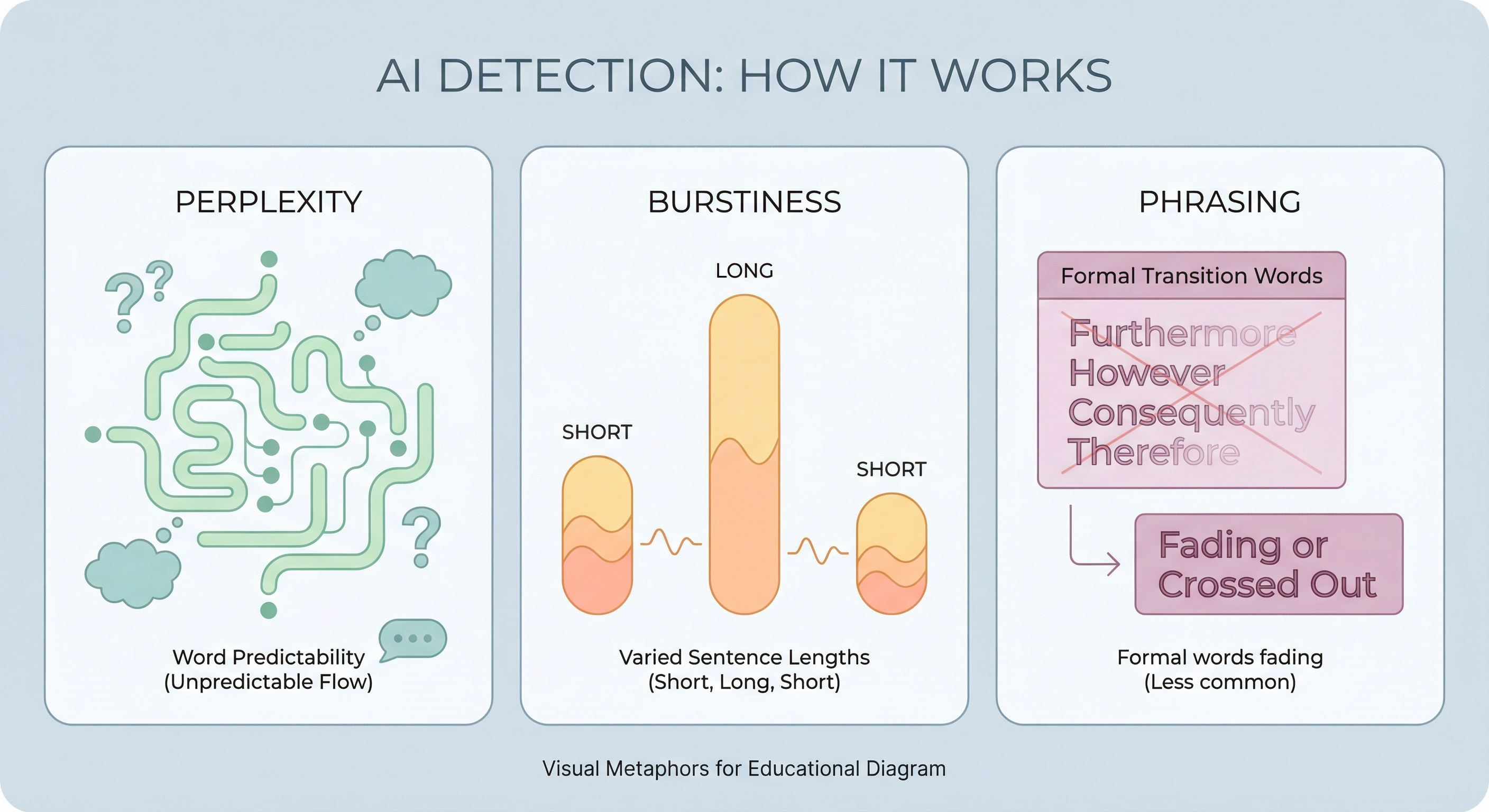 - Perplexity — How predictable the next word is. AI tends to choose statistically likely words; human writing is messier and less predictable.